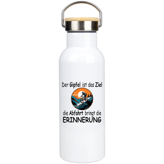 Edelstahl Trinkflasche 500ml mit Bambusdeckel | Der Gipfel ist das Ziel - die Abfahrt bringt die Erinnerung